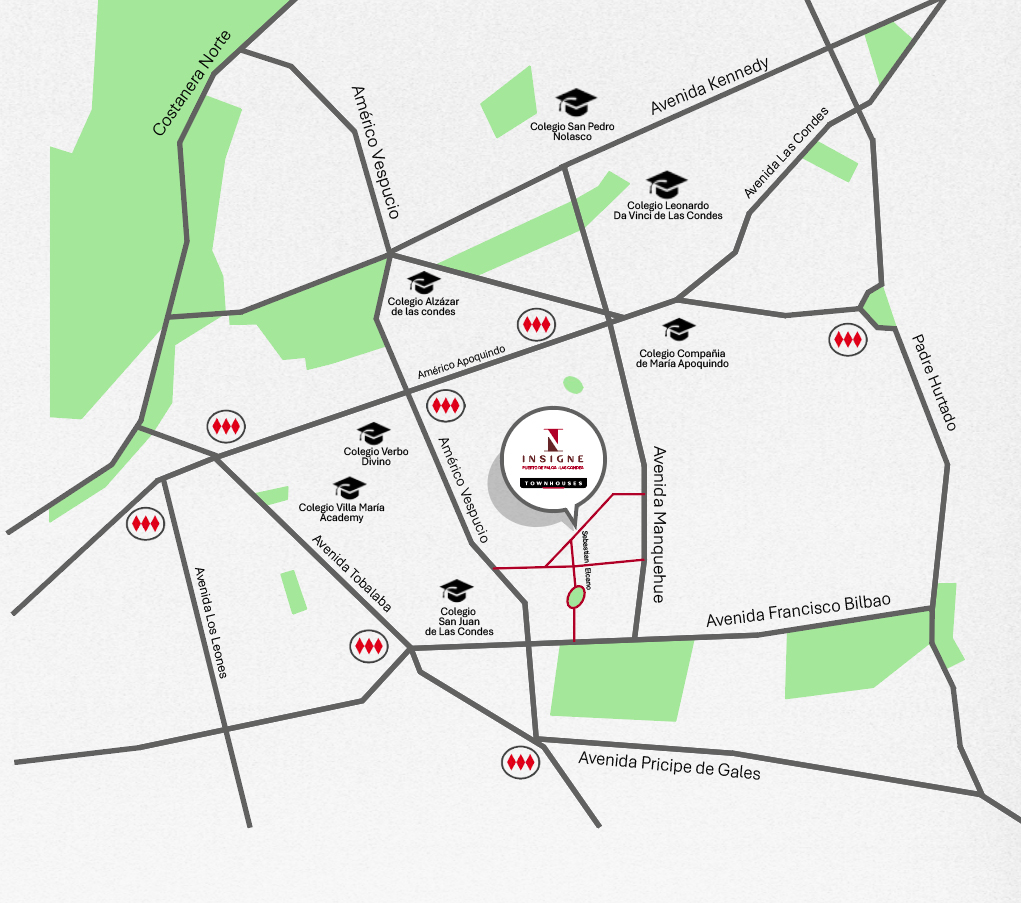 Insigne Puerto de Palos se ubica en uno de los barrios más consolidados del sector oriente, el cual se caracteriza por su ambiente residencial y tranquilo, rodeado de áreas verdes y parques. Además, cercano a supermercados, colegios, restaurantes y una gran conectividad a través de la Autopista Vespucio Oriente.